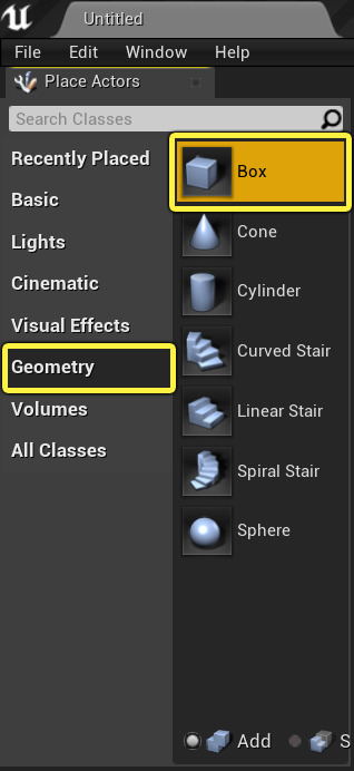 액터 패널에 상자를 드래그하여 레벨 뷰포트에 옳겨줍니다.