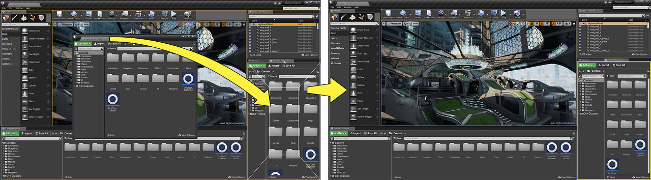 예를들어 크롬에 많은 탭들을 분리할수도있고 하나로 합치는것처럼 언리얼 엔진4에도 그런 기능이 가능합니다.
