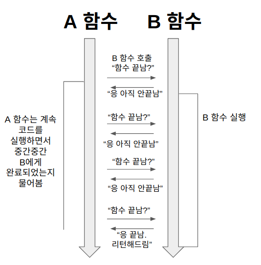 2. 하지만 A함수는 B함수의 리턴값이 필요, 중간중간 마다 B함수에게 완료됬는지 물어봄(동기)