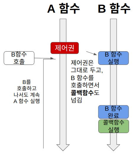 1. A 함수는 B 함수의 리턴값에 신경쓰지 않고, 콜백함수를 보냄(비동기)