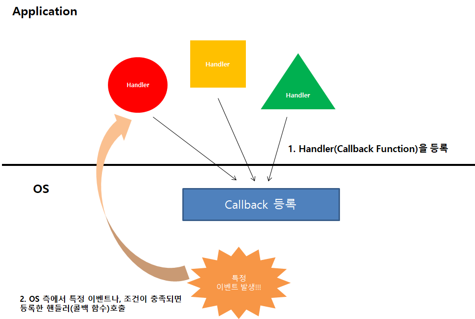 즉 미리 함수를(C++인 경우 함수 포인터를) OS에 등록을 해놓고 어떠한 이벤트가 발생이되면 그 함수를 바로 실행하여 값을 받는 형식입니다.